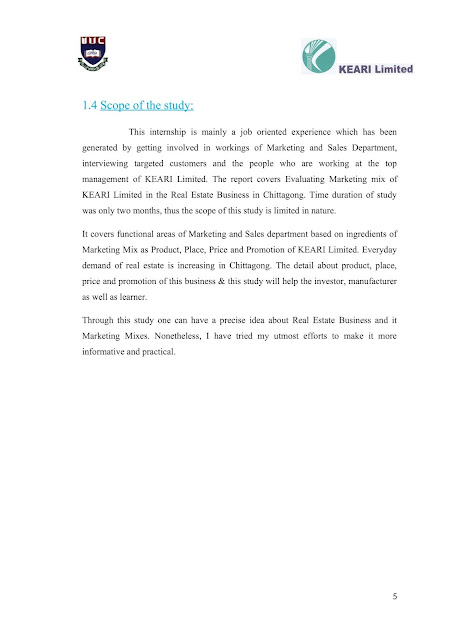 It covers functional areas of Marketing and Sales department based on ingredients of Marketing Mix as Product, Place, Price and Promotion of KEARI Limited. Everyday demand of real estate is increasing in Chittagong. The detail about product, place, price and promotion of this business & this study will help the investor, manufacturer as well as learner.
